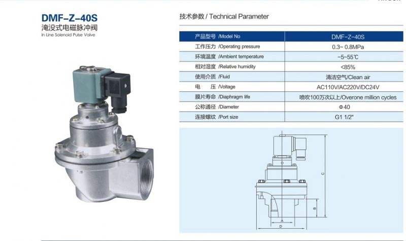 40S直角電磁脈沖閥為1.5寸脈沖閥,除塵器上常用來噴吹2.5米長布袋,噴吹布袋數(shù)量可以根據(jù)實(shí)際噴吹壓力和濾袋材質(zhì)來決定。