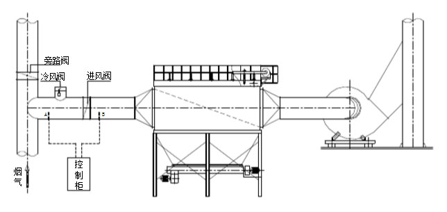 煙氣溫度一旦高于除塵器正常使用溫度,自動控溫裝置啟動冷風閥,放進冷風,同時電鈴自動報警,提示操作工采取降溫措施;當煙氣溫度降至正常使用溫度時,冷風閥自動關閉,操作也恢復正常;當采取放冷風后,煙氣溫度仍超過除塵器的允許O高溫度時,進風閥會自動關閉,旁路閥打開,煙氣進入旁路煙道排空,確保除塵器的安全運行。