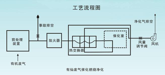 本裝置是利用催化劑做中間體,使有機氣體在較低的溫度下燃燒、生成無害的二氧化碳和水蒸氣排放。反應方程式: